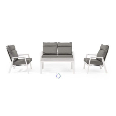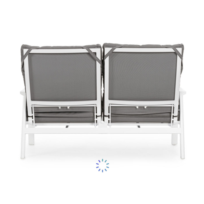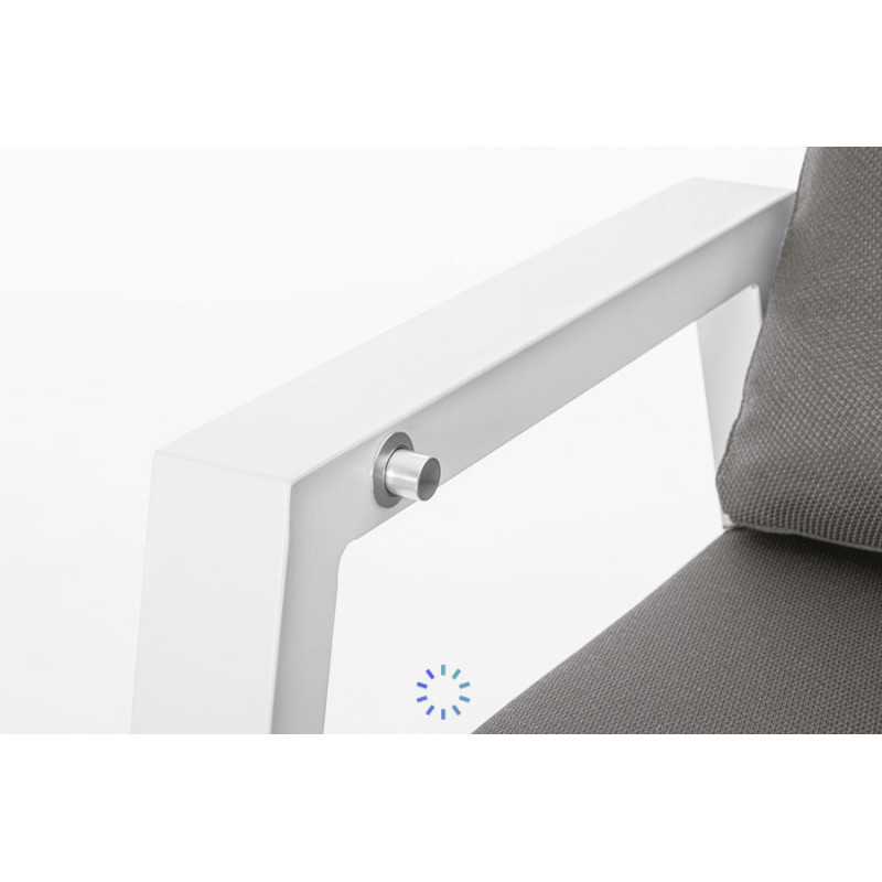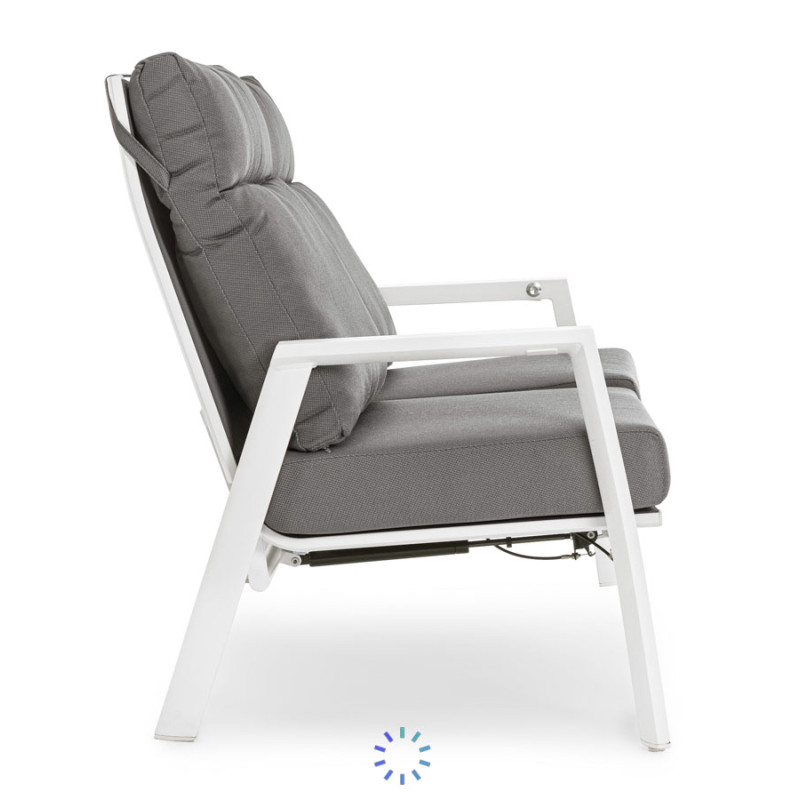 ESTRUCTURA DE ALUMINIO BARNIZADA A POLVO (POLISTER). RESPALDO RECLINABLE EN POSICIÓN LIBRE Y ASIENTO DE TEXTILENE 1X1. COJINES DESENFUNDABLES DE TEJIDO REPELENTE AL AGUA OLEFIN (100% POLIPROPILENO). TORNILLERÍA DE ACERO INOXIDABLE.