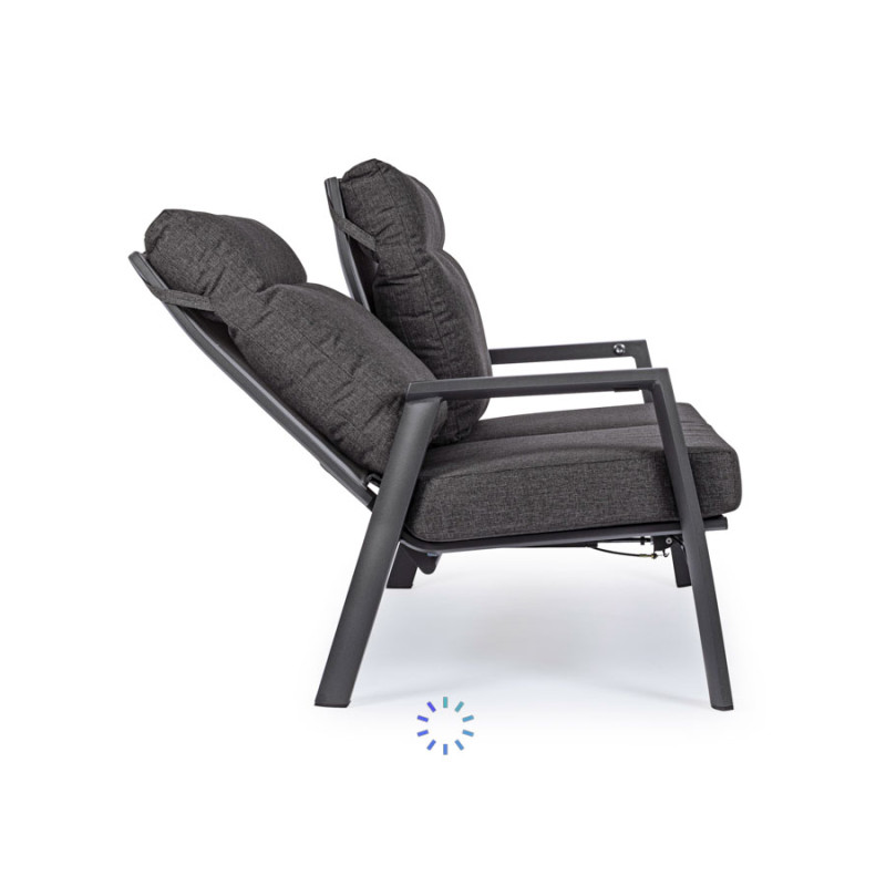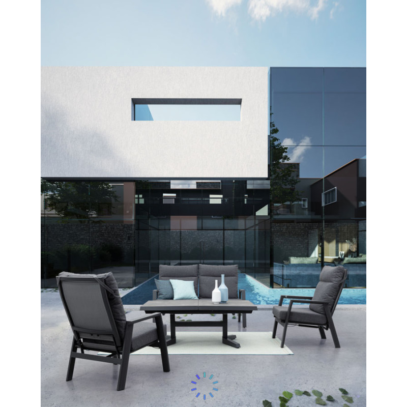 ESTRUCTURA DE ALUMINIO CON REVESTIMIENTO EN POLVO (POLISTER). RESPALDO RECLINABILE EN LIBRE POSICIÓN Y ASIENTO DE TEXTILENE 1X1. COJINES DESENFUNDABLES EN TEJIDO REPELENTE AL AGUA OLEFIN (100% POLIPROPILENO).