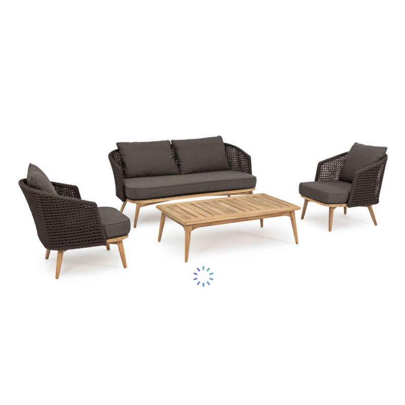ESTRUCTURA DE ALUMINIO CON REVESTIMIENTO EN POLVO (POLISTER). PATAS DE TECA - SVLK (MADERA PROCEDENTE DE BOSQUES SOSTENIBLES) ACABADO RéSTICO. ENTRAMADO DE CUERDAS PARA EXTERIOR (POLIPROPILENO), HIDROREPELENTE Y RESISTIENTE A LOS RAYOS UV. COJINES DESENFUNDABLES CON TEJIDO SUNBRELLA (100% ACRÖLICO), HIDROREPELENTES Y RESISTIENTES A LOS RAYOS UV. MULLIDO PARA EL EXTERIOR QUICK DRY FOAM (ANTIHUMEDAD).