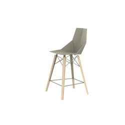 Taburete con asiento y respaldo de polipropileno. Las patas son el conjunto de una estructura metálica y madera. La estructura metálica está pintada con pintura epoxi a juego con el asiento.